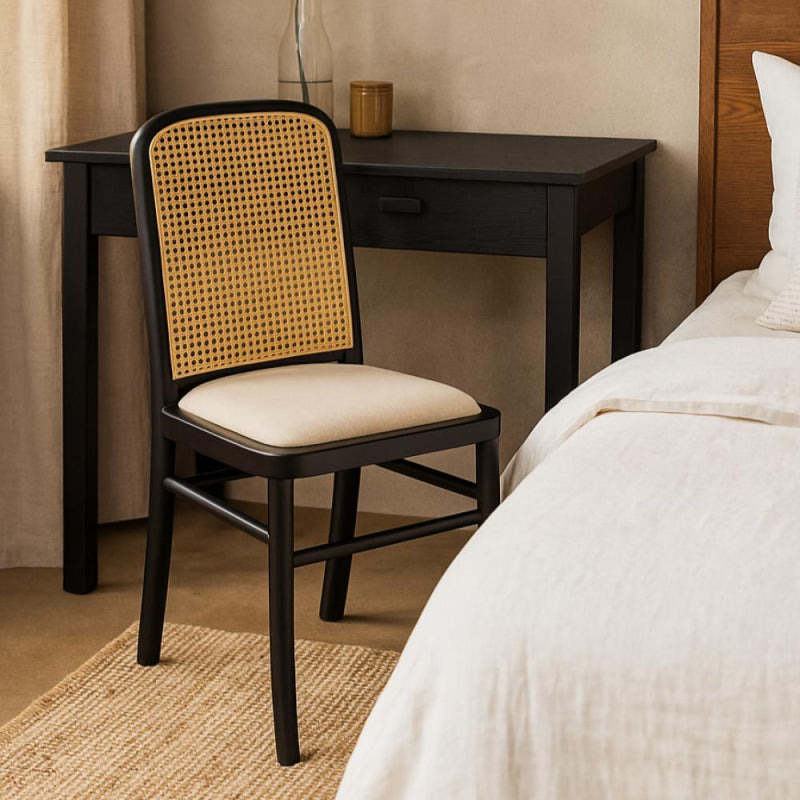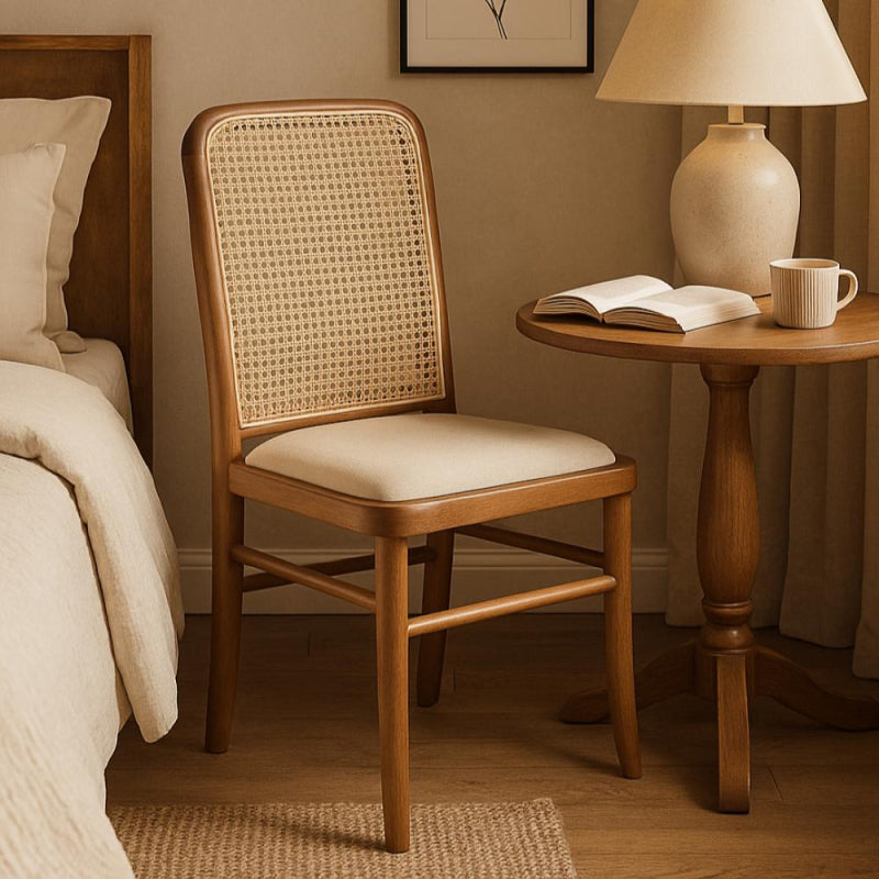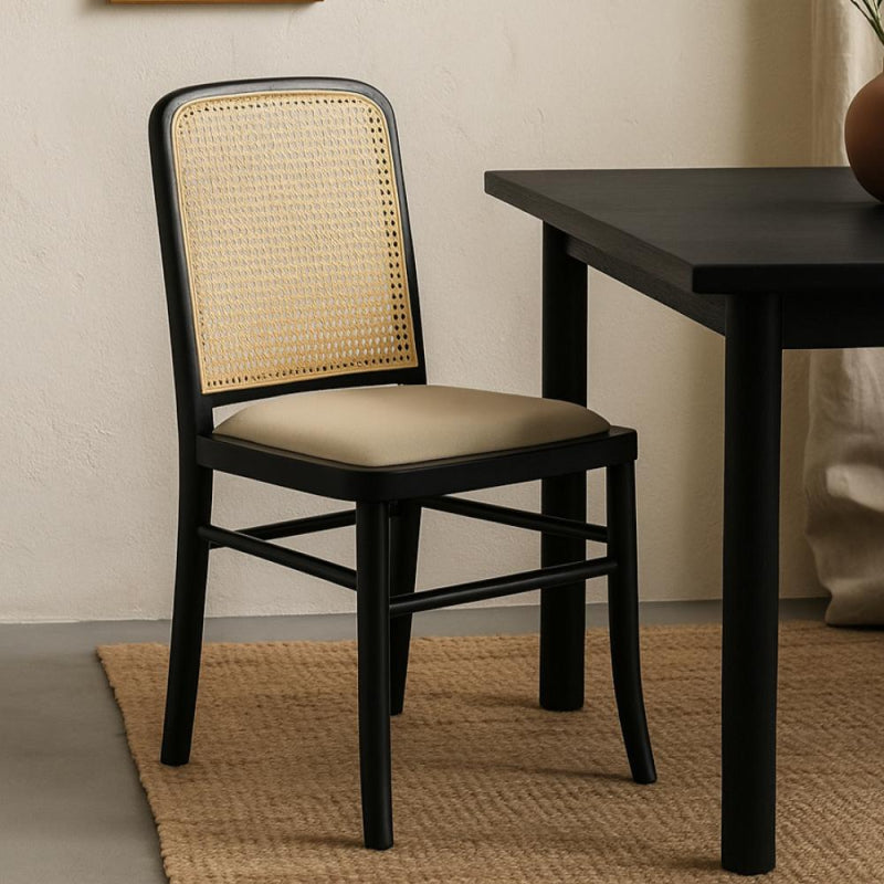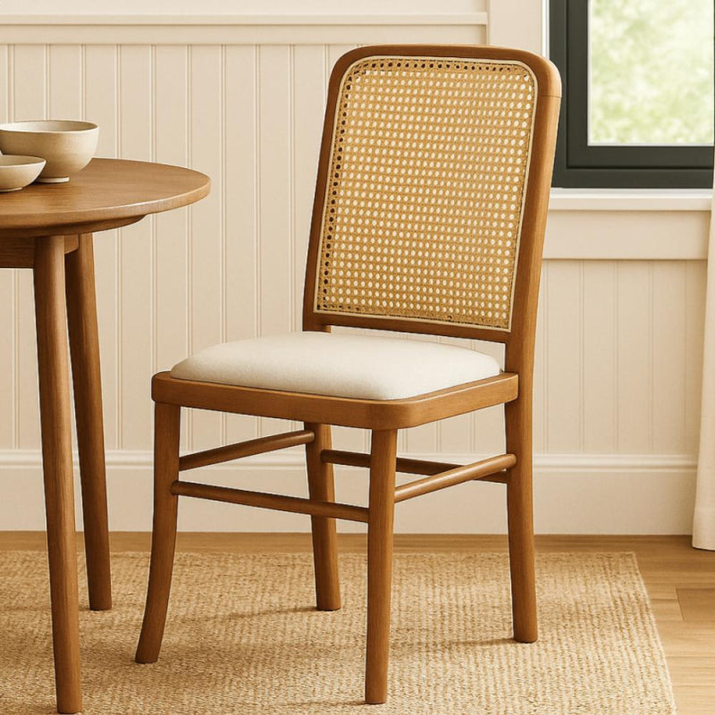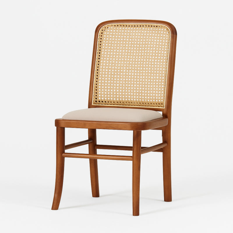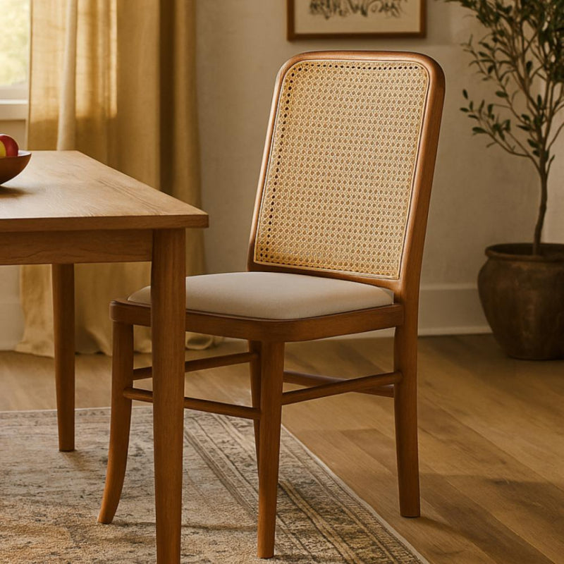 A classic wooden chair that combines simplicity and elegance, with a rattan backrest that adds a natural and warm touch to any space.