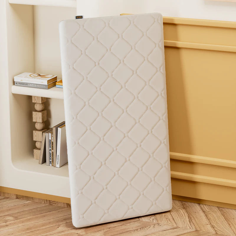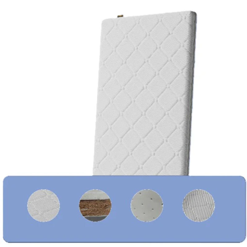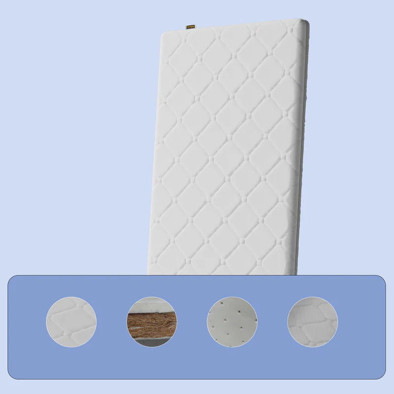 Made of coconut coir which is a safe material for a baby's crib mattress because it is a firm, natural, and breathable fiber that promotes proper spinal alignment and a cool sleep environment. To ensure optimal safety, choose a mattress with coconut coir, as these materials are free from harmful chemicals and toxins that are not regulated in conventional mattresses