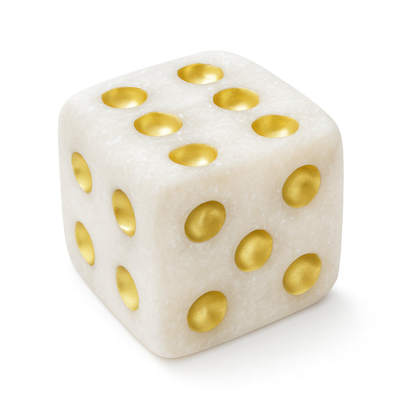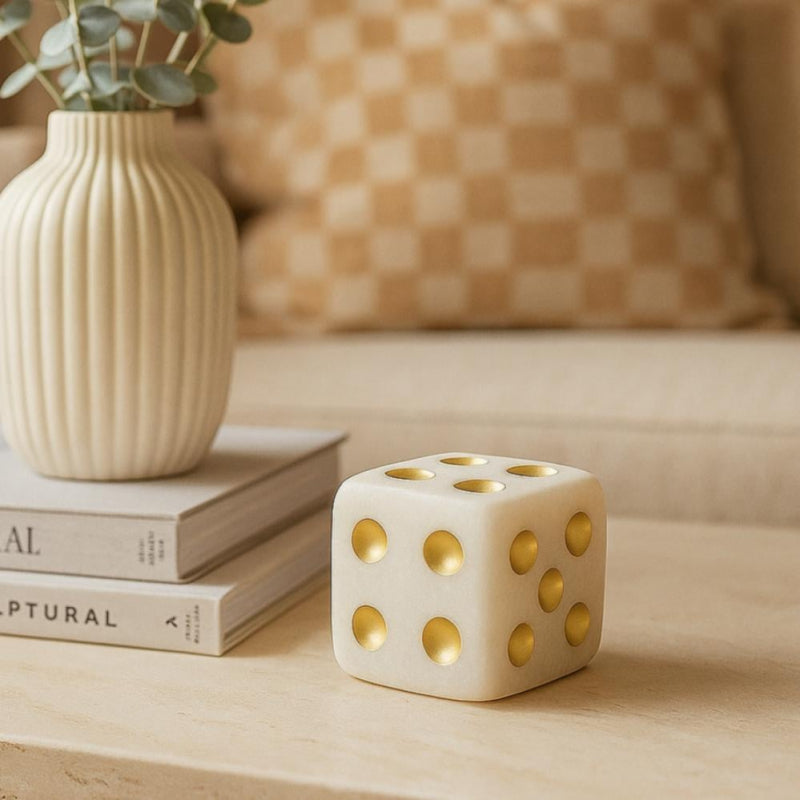 This decorative dice sculpture in ivory with gold accents adds a touch of understated luxury to your space.