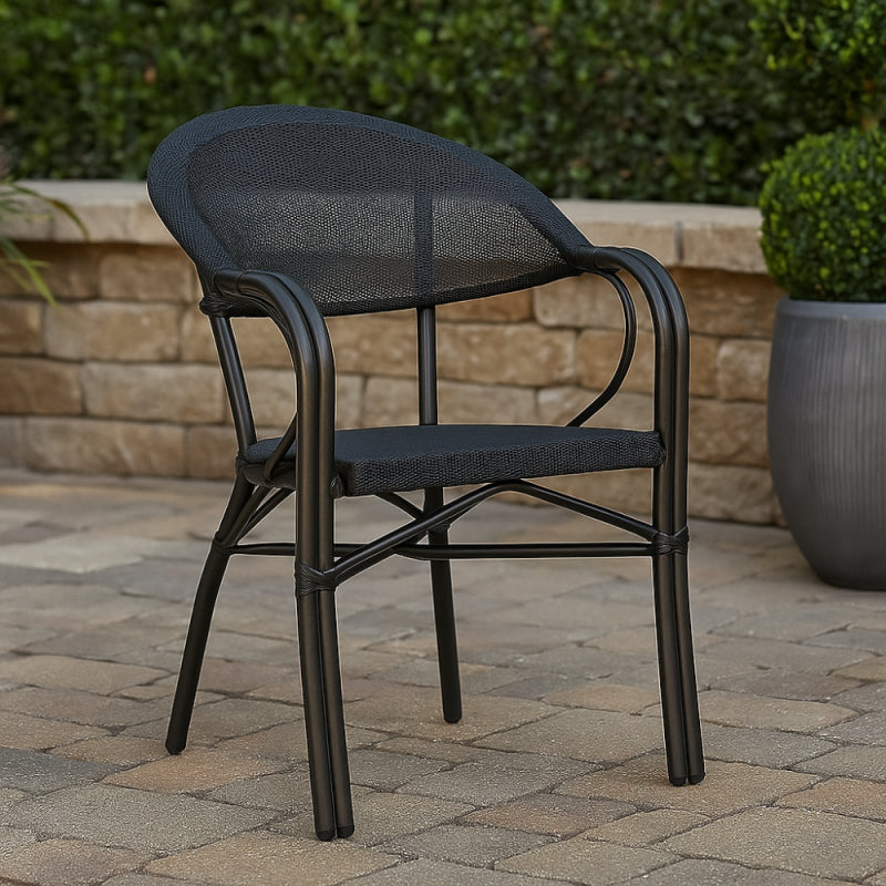 Design: Featuring a classic, lightweight design inspired by bistro/café chairs, with a curved backrest and a mesh seat that provides excellent ventilation. The arms are seamlessly integrated for comfort.