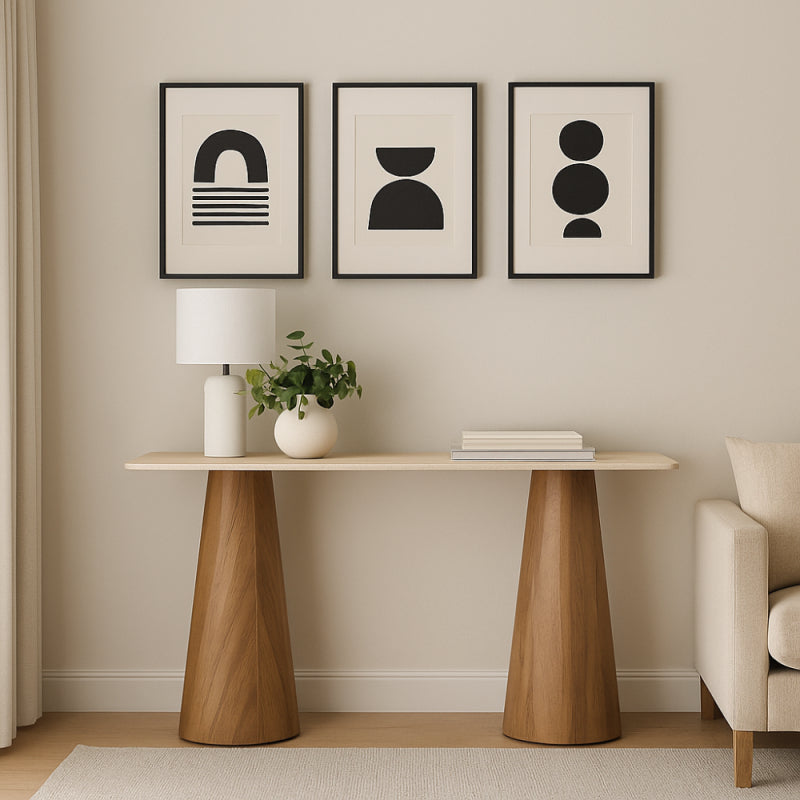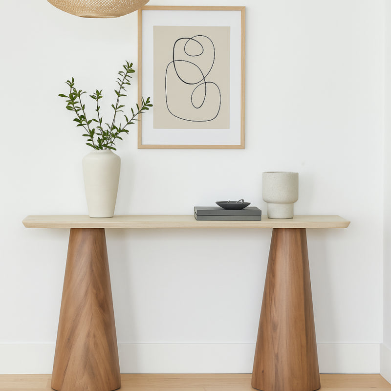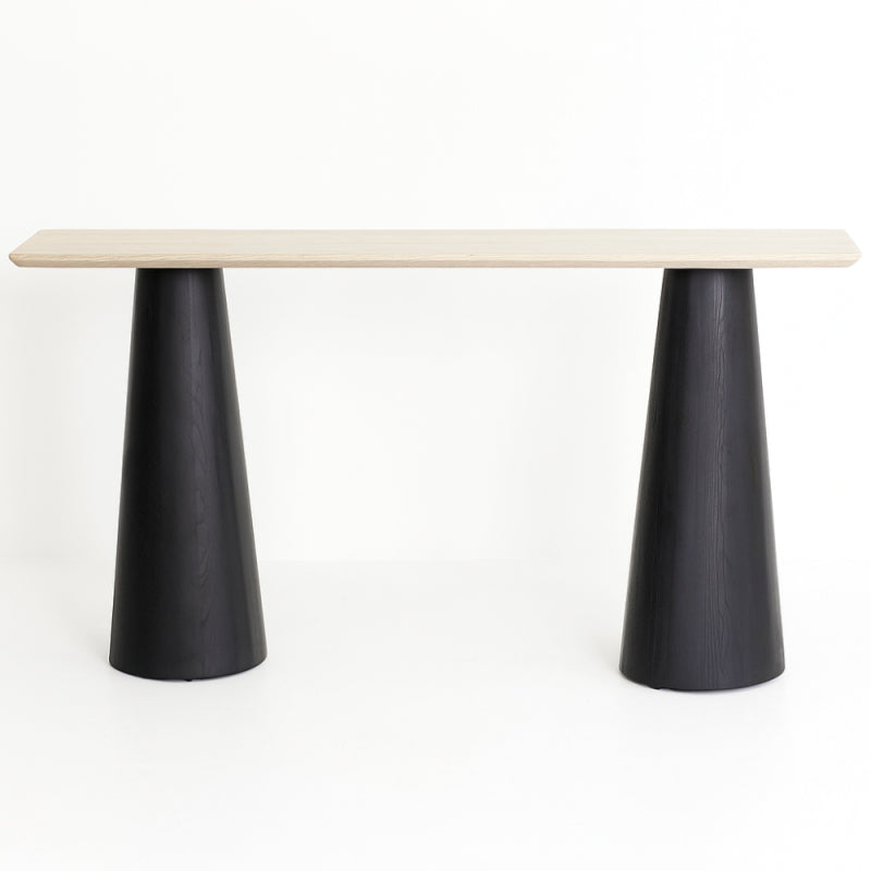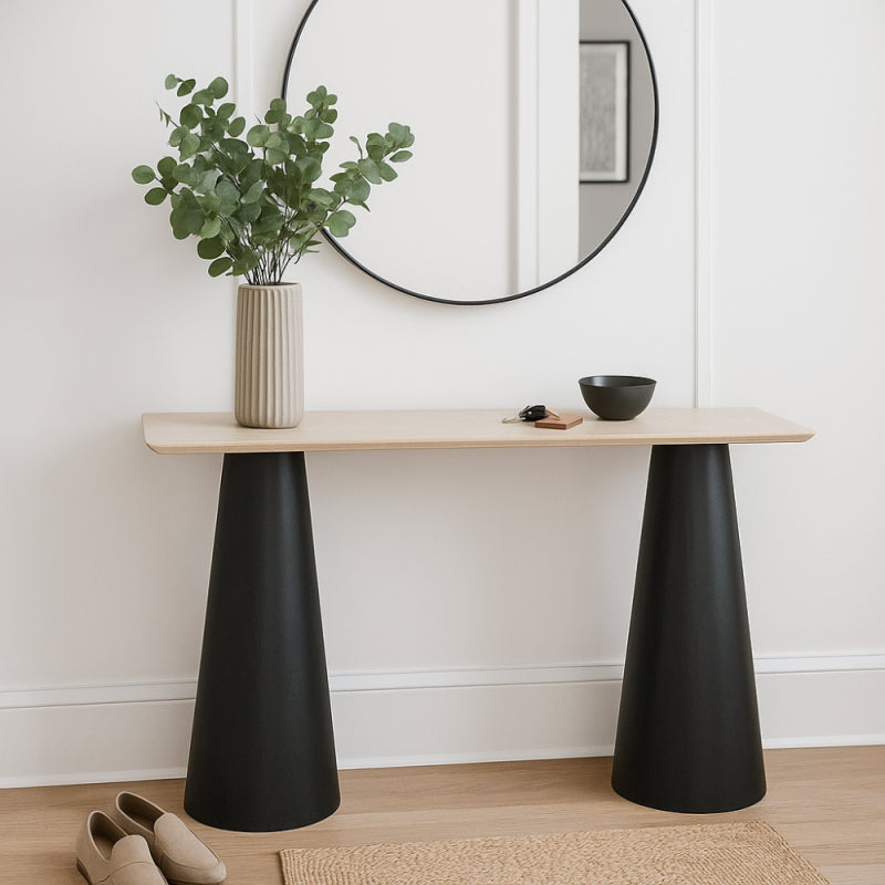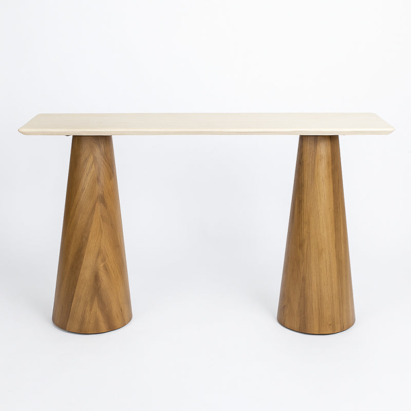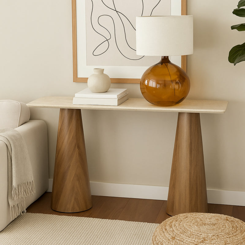 A stylish console that combines simplicity and luxury thanks to its serene beige surface and striking, modern conical base. Its balanced colors and flowing lines make it a beautiful addition to entryways and living rooms, adding a touch of understated elegance. Pair it with a vase, books, or simple accessories to complement the space.