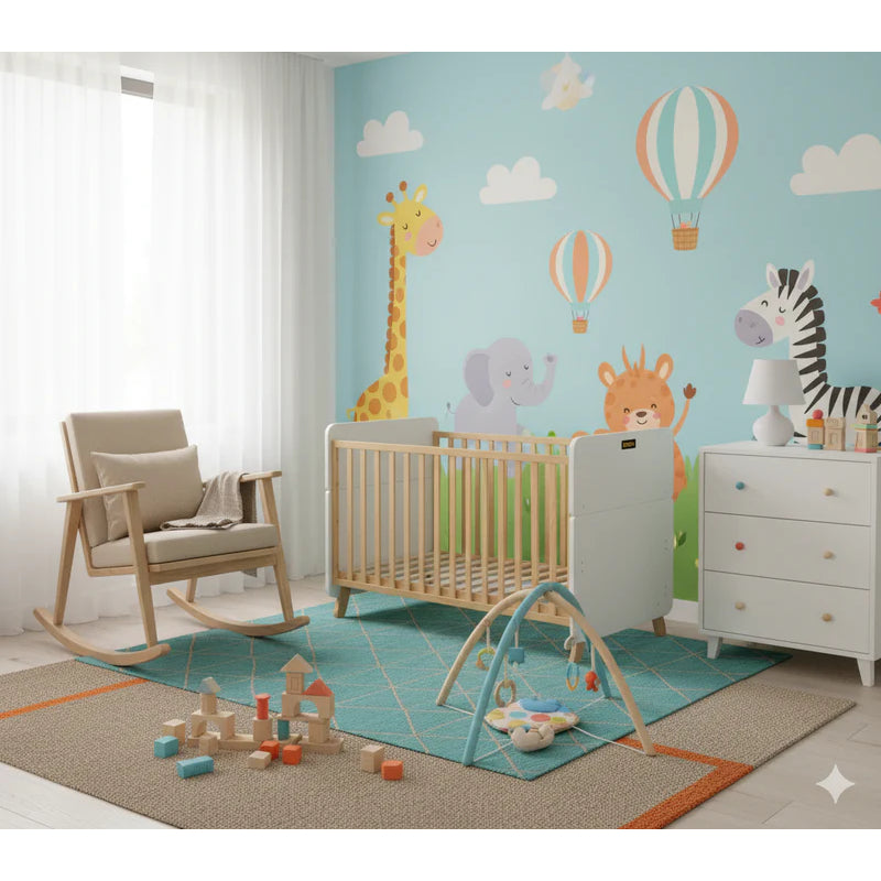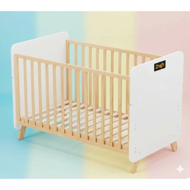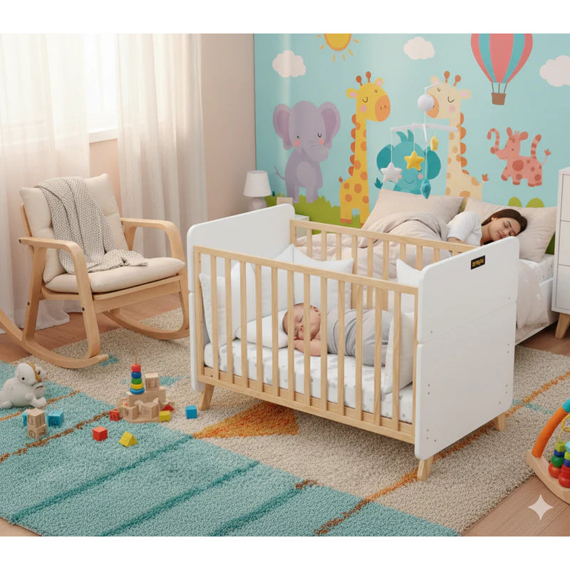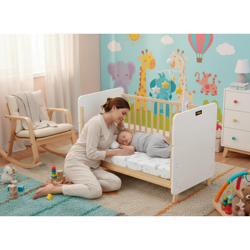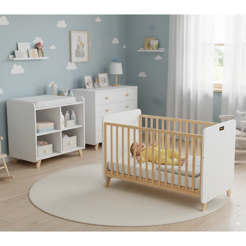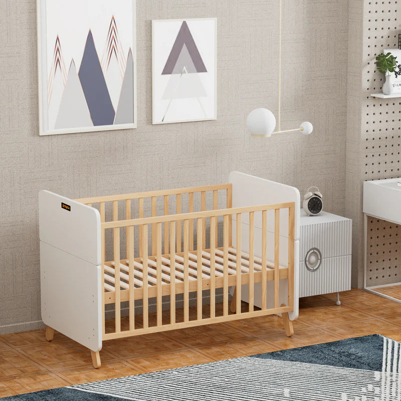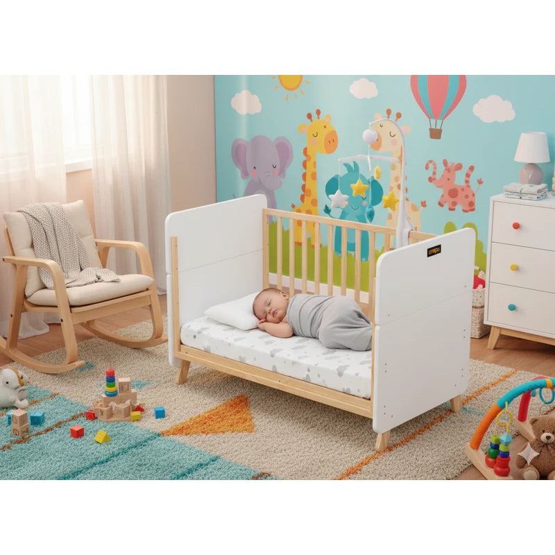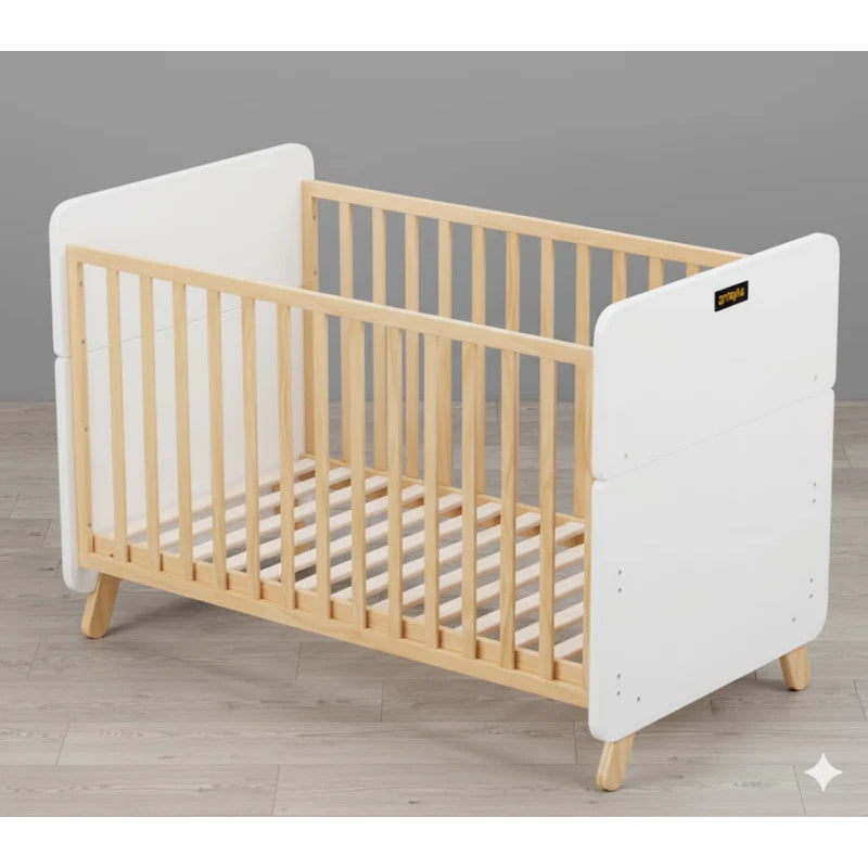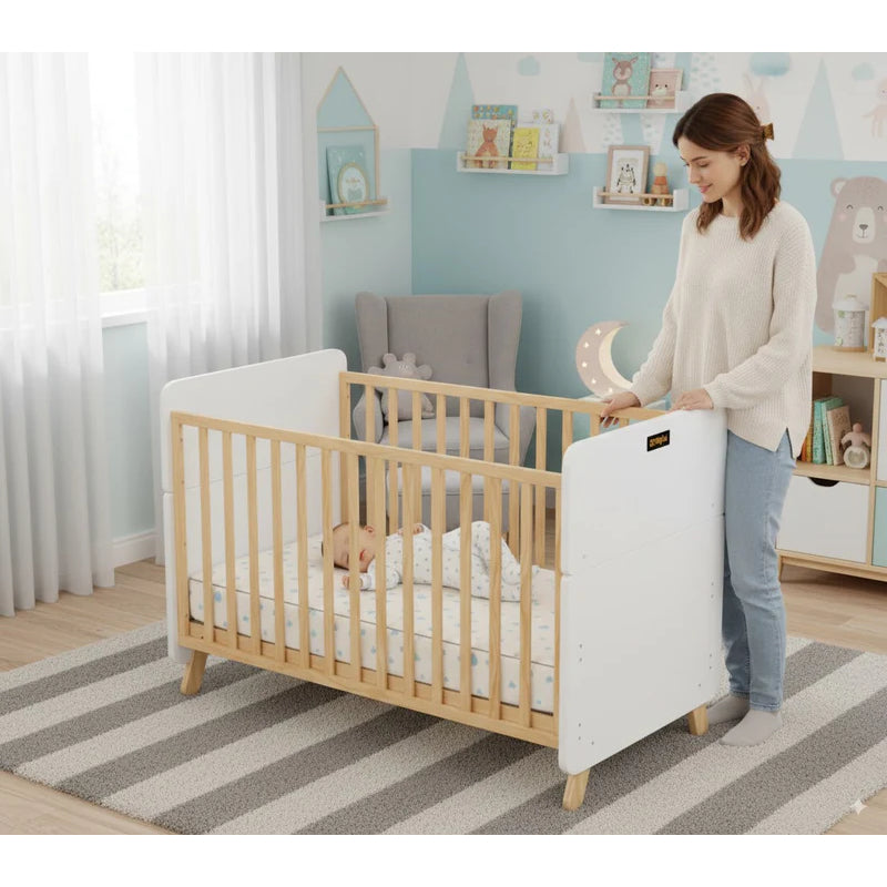 Invite the charm of a minimalist, functional, and comfortable aesthetic design into your baby's nursery with our Baby Cot. Boasting a distinctive Scandi-style finish, the Baby Cot is an epitome of simplicity meeting functionality. Its modern silhouette, accentuated by rounded corners, angled feet, and an eco-friendly finish, will undoubtedly resonate with parents who have an affinity for Nordic design sensibilities. Crafted meticulously from a combination of engineered timber and sustainably sourced pine wood, this two tone cot bed ensures longevity. It's not just a piece of furniture; it's an investment in your child's comfort and safety.