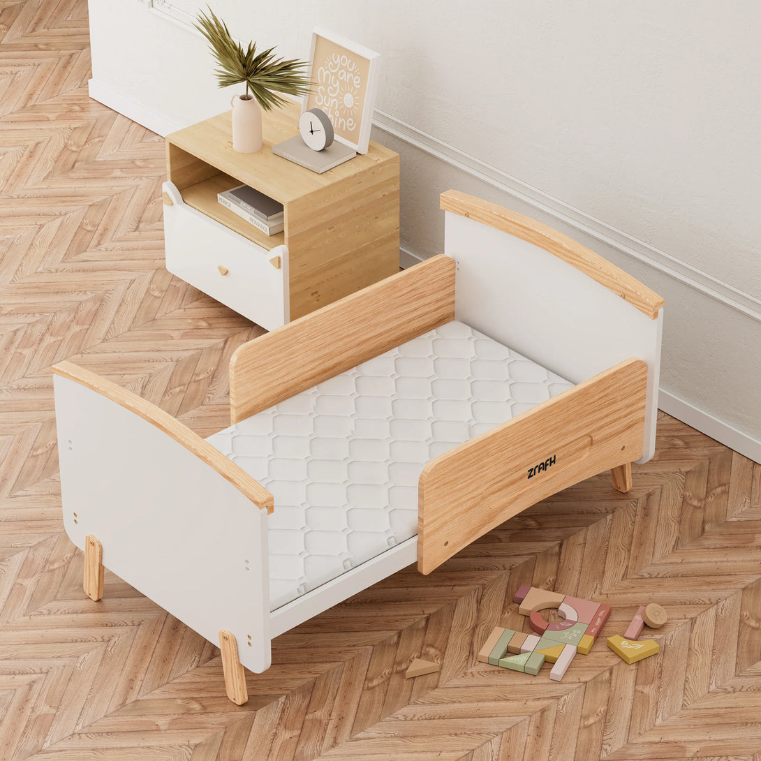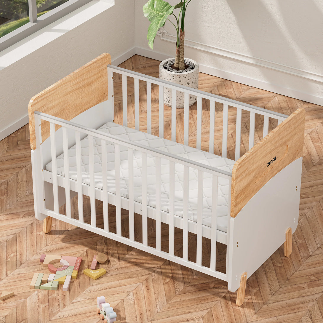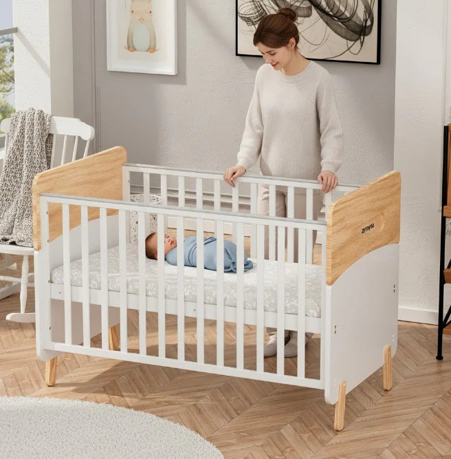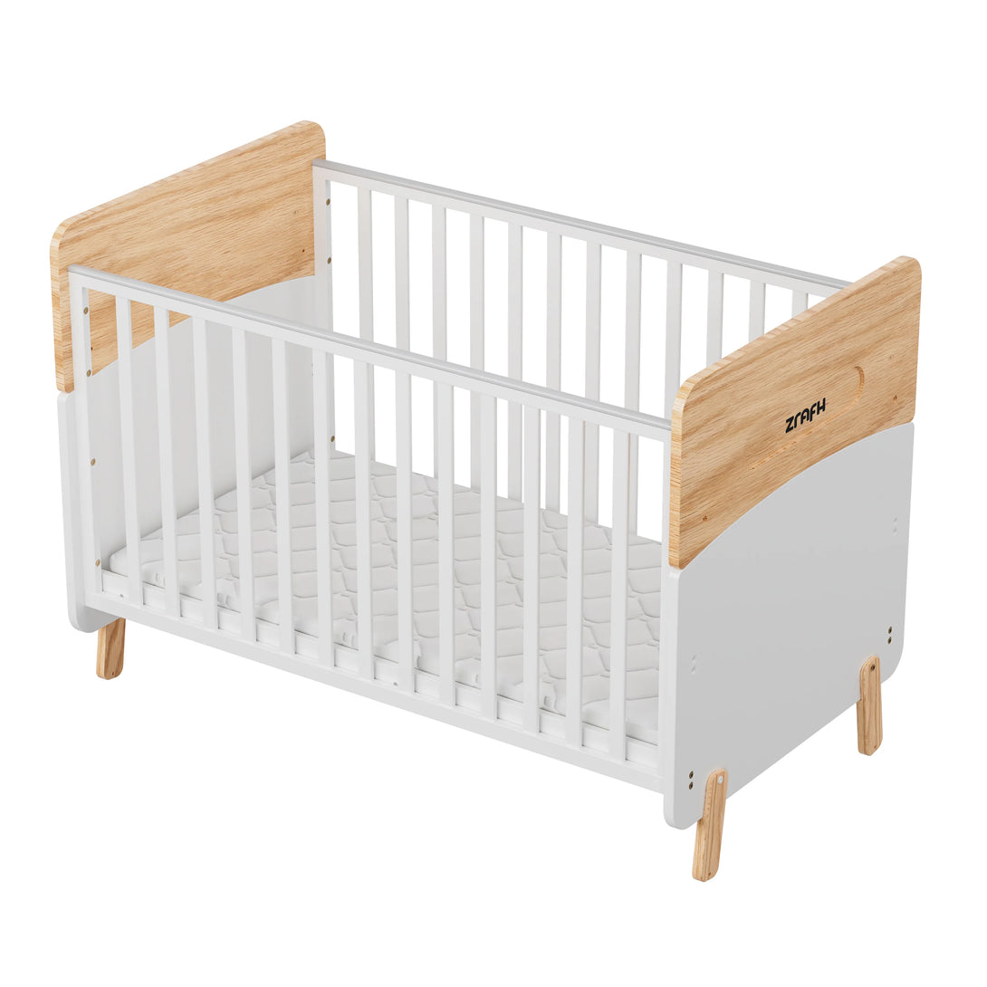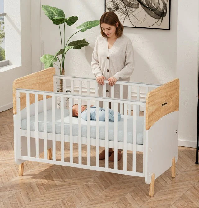 With a minimalist aesthetic and a modern two-tone colorway, the Convertible Baby Crib to Toddler Bed offers a unique and stylish addition to contemporary nursery designs. Crafted from a combination of sustainable pine wood and engineered timber, this modern baby cot provides fantastic value and is designed to support your little one beyond the nursery.