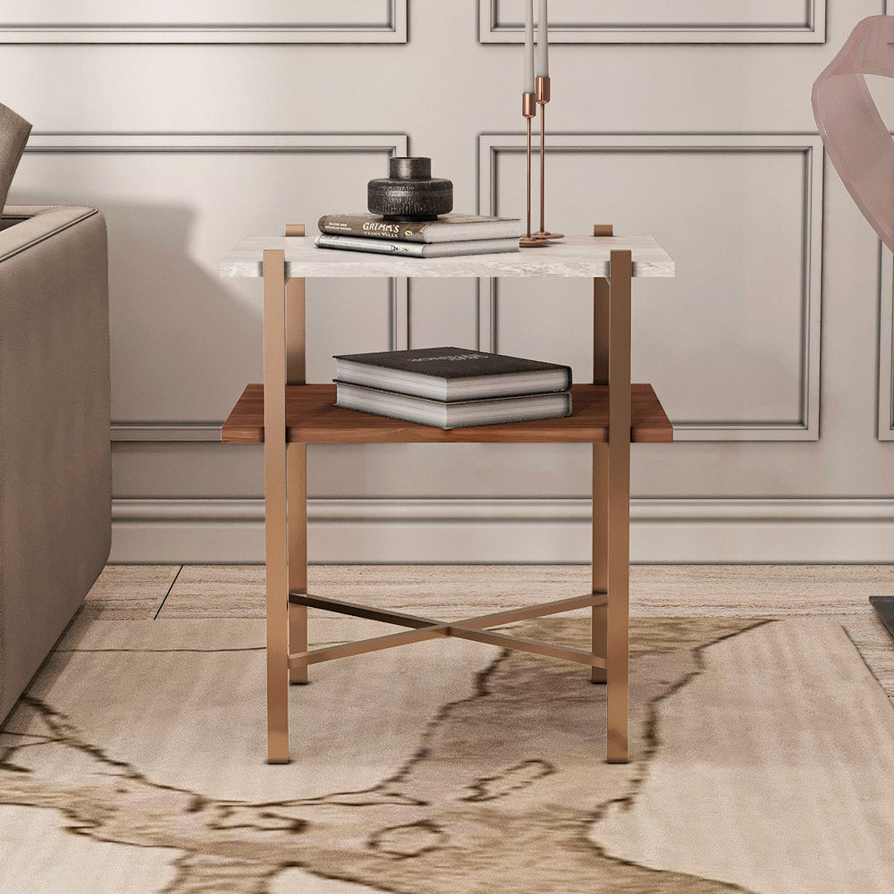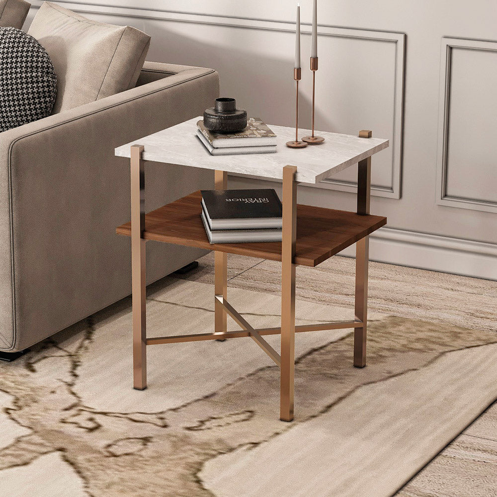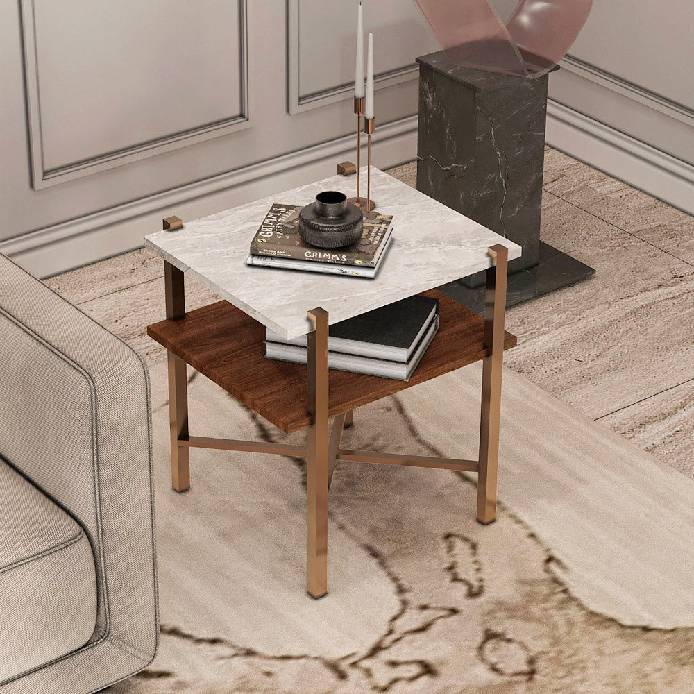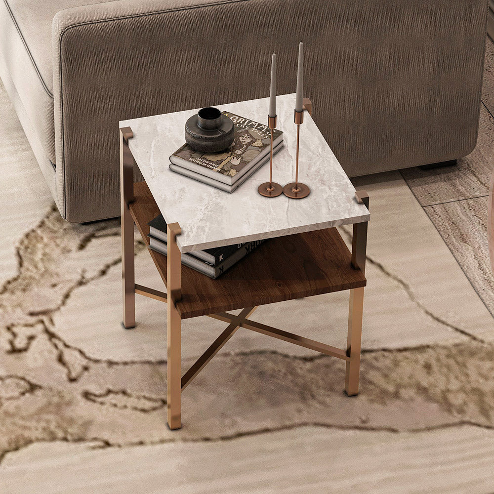 طاولة جانبية فاخرة من الحديد والخشب مصنع - 40×40×50 سم - أبيض وبني وذهبي من الهوم - AL-87