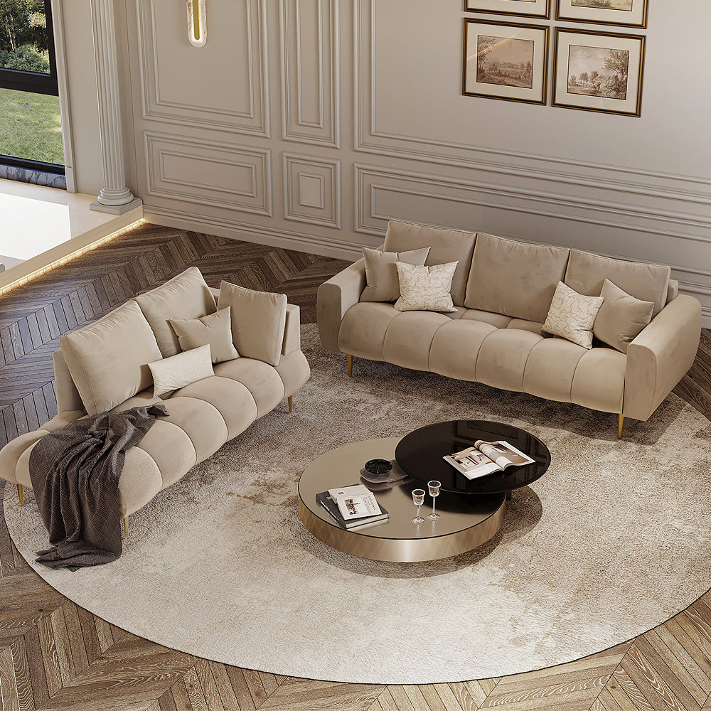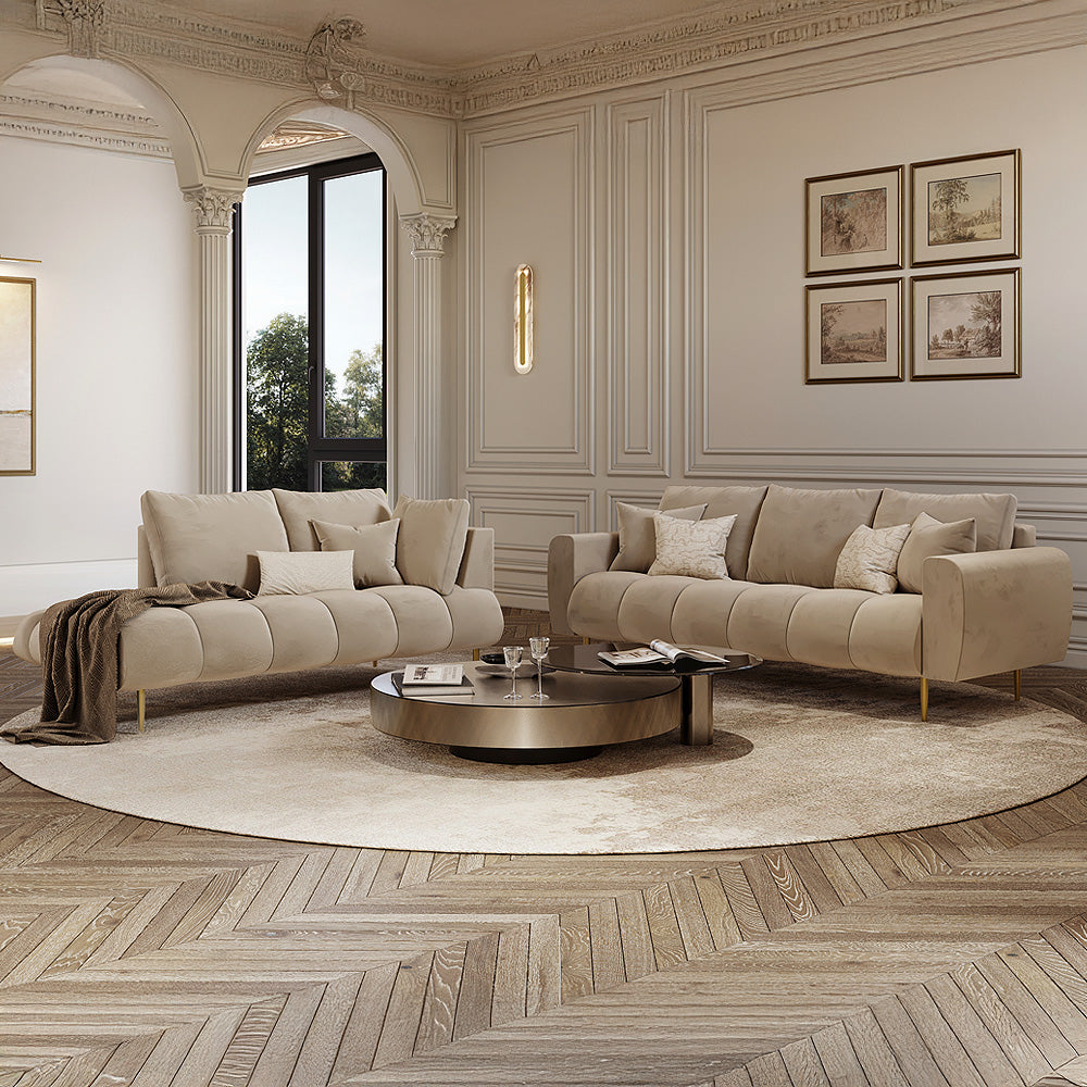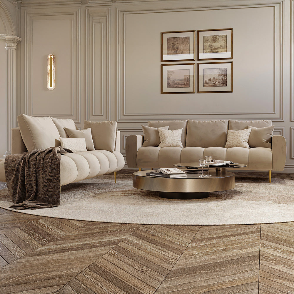 أضف لمسة من الفخامة إلى غرفة المعيشة مع طقم الكنب من الهوم، المصنوع بمزيج يجمع بين الراحة والأناقة العصرية. يتميز الطقم بكسوة فاخرة من المخمل البيج تمنح إحساسًا بالدفء والترف، فيما يوفّر الهيكل المصنوع من الخشب السويدي المتانة والثبات على المدى الطويل. أما الأرجل المعدنية المصنوعة من الحديد الصلب فتمنح الطقم مظهراً عصريًا أنيقًا ينسجم مع مختلف الديكورات.