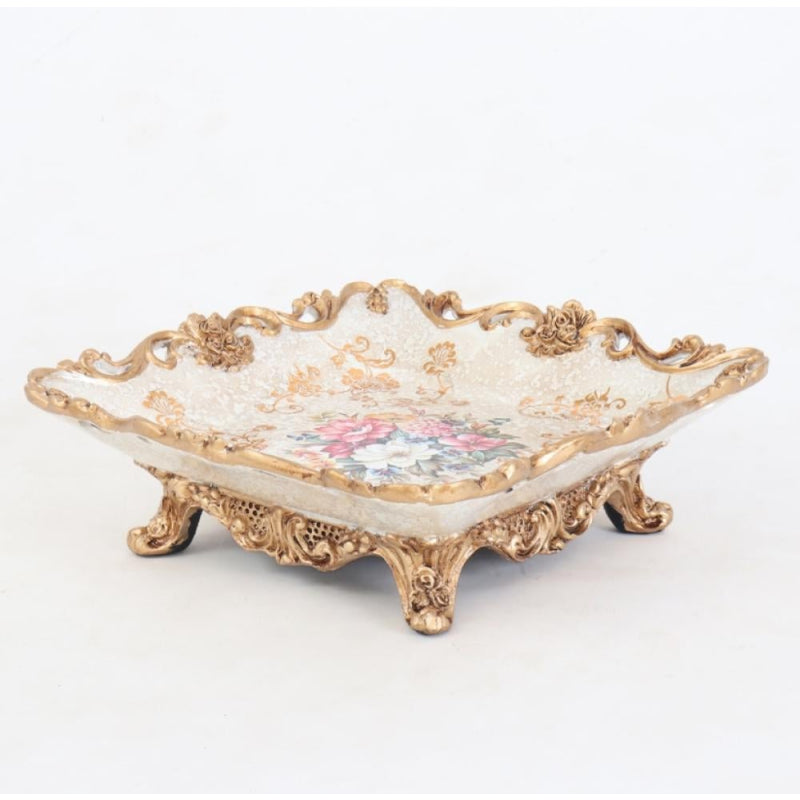 It features a spacious design with wavy edges adorned with gold embellishments, adding a regal presence to any space. A beautiful floral design in the center lends the piece a soft and inviting feel.