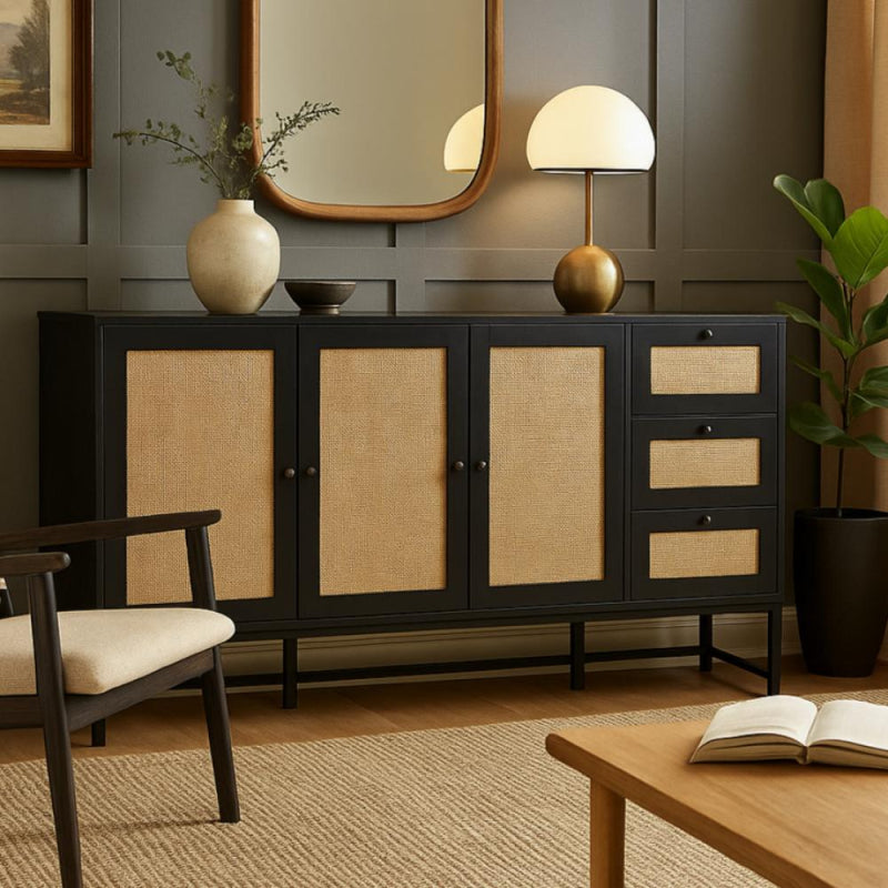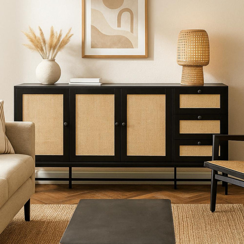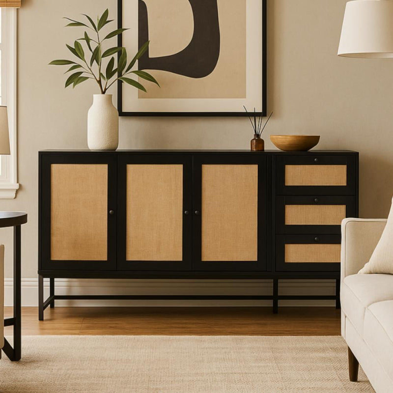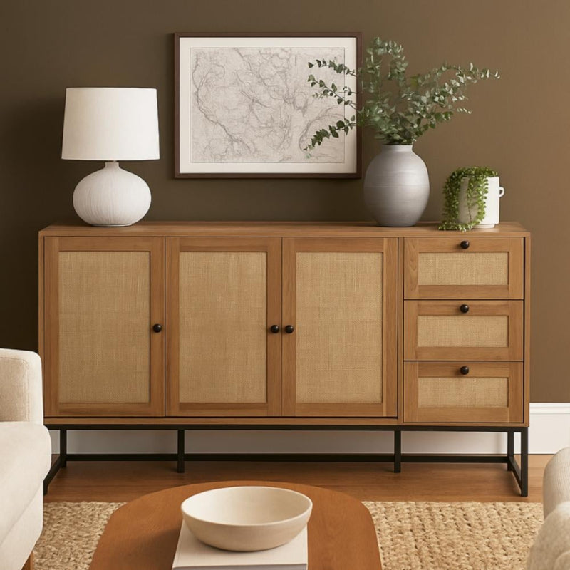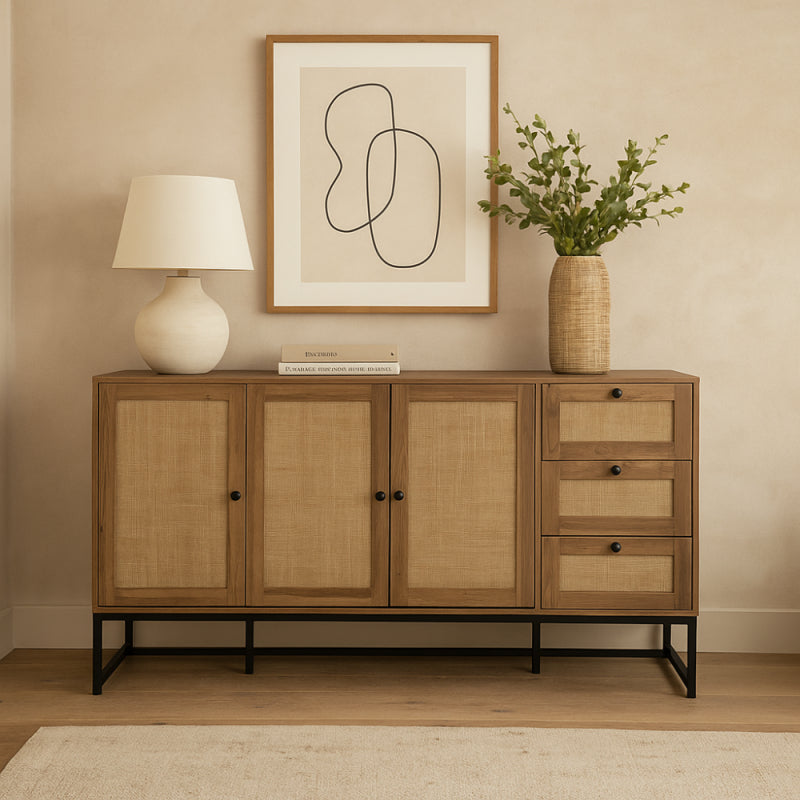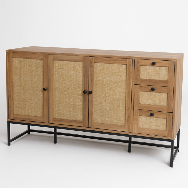 Add a touch of sophistication to your entryway or living room with this thoughtfully designed console, combining beauty and practicality. It features a stylish harmony of natural wood, modern metal accents, and rattan weaving, creating a warm and luxurious feel.