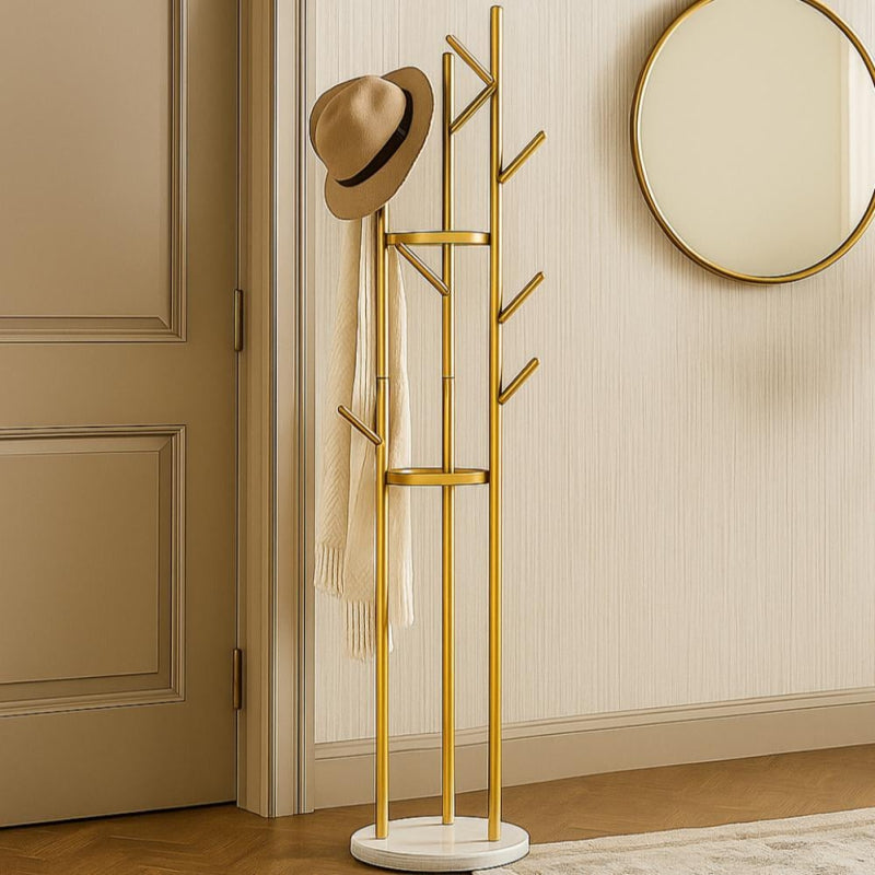 Add a touch of luxury and practicality to your home with this stylish floor rack, designed in a modern style that combines elegance and strength. Its shimmering gold finish lends a sophisticated air to any space, and it features multiple hooks for easy hanging and organization of clothes, bags, and accessories.