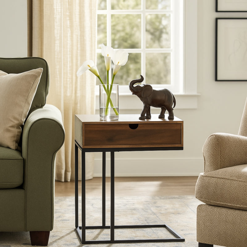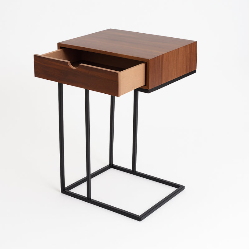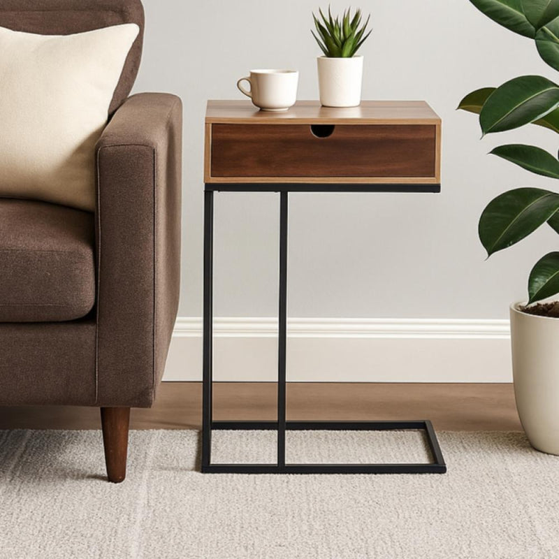 A modern side table that combines a warm wooden top with a slim metal base, giving it a simple yet elegant look. It comes with a practical drawer to help you store small items like remotes, keys, or everyday accessories, keeping your seating area organized and stylish without clutter.