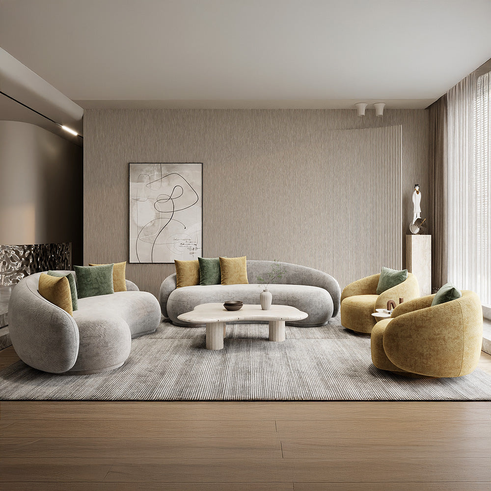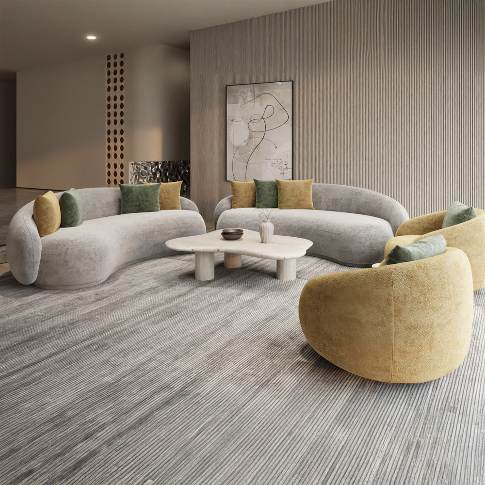 أضف وسائد رمادية وصفراء بتدرجات مختلفة لإبراز التباين. سجادة بلون محايد (بيج أو أبيض) تبرز جمال القماش البوكلية، ويمكنك إضافة طاولة قهوة خشبية أو معدنية لإكمال المظهر العصري.