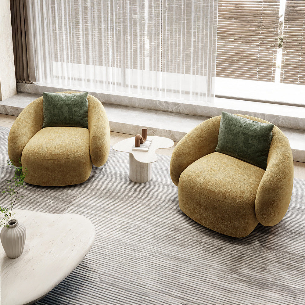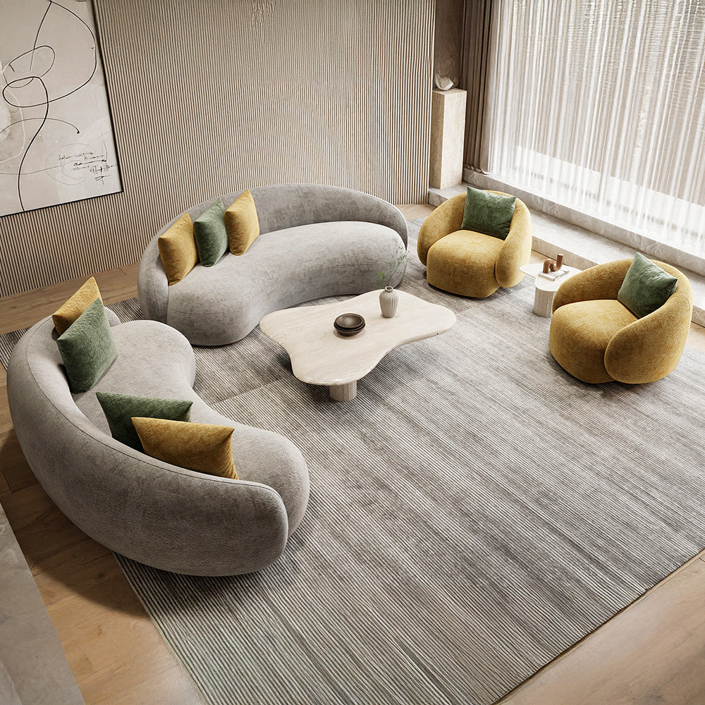 تم تصميم هذا الطقم ليكون القطعة الأساسية في غرفة المعيشة لديك، حيث يجمع بين الفخامة والراحة. الكنبات باللون الرمادي الفاتح تمنح المكان هدوء وأناقة، بينما تضيف الكراسي الصفراء لمسة حيوية عصرية تلفت الأنظار.