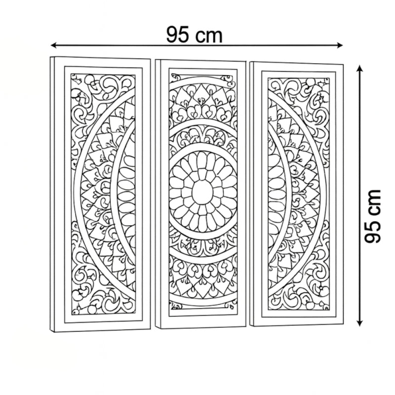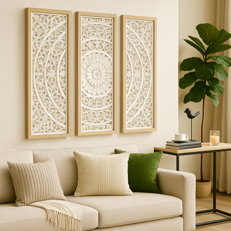 A three-piece wall art piece with a subtle decorative design that blends classic touches with sophisticated bohemian style.